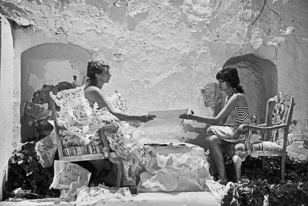 Το βράδυ της 28ης του περασμένου Ιούνη η εικαστικός Κατερίνα Ζαχαροπούλου παρουσίασε στην αυλή του παλιού Γυμνασίου της Ύδρας, στο ιστορικό Σαχτούρειο, μια σιωπηλή performance. Ήταν ενταγμένη στην καθιερωμένη έκθεση Hydra School Project που οργανώνει κάθε καλοκαίρι στο νησί ο εικαστικός και επιμελητής Δημήτρης Αντωνίτσης. Εφέτος η έκθεση συνδέεται με το έτος Καβάφη, για αυτό έχει γενικό τίτλο «pō(-)ĭ-trē» (Poetry) και θέμα το κείμενο και την εικόνα.