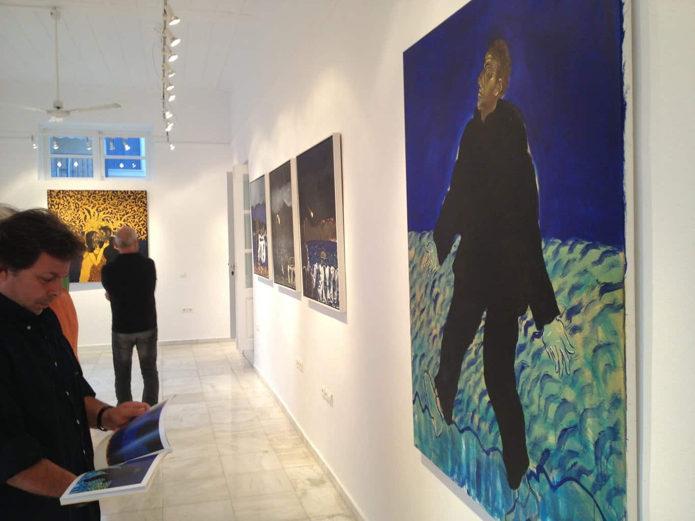 Μην φανταστείτε, πάντως, ειδυλλιακές απεικονίσεις, καθησυχαστικά τοπία και γλυκερές αναπαραστάσεις της πραγματικότητας. Στη δουλειά του Τάσου Μαντζαβίνου η θάλασσα με τα βαθυκύανα, σχεδόν μαύρα, νερά της δεν αφήνει, άλλωστε, πολλά περιθώρια για ονειροπόληση. Ένα αίσθημα ανησυχίας διαχέεται στο χώρο και από τις φιγούρες που κατοικούν τις ζωγραφικές επιφάνειες των έργων του : παραμορφωμένες, απορροφημένες στον πυρήνα τους, αρνούμενες να κολακέψουν τους θεατές, εν μέσω μιας υπαρξιακής κρίσης με τα χέρια τους σε στάση απόγνωσης.